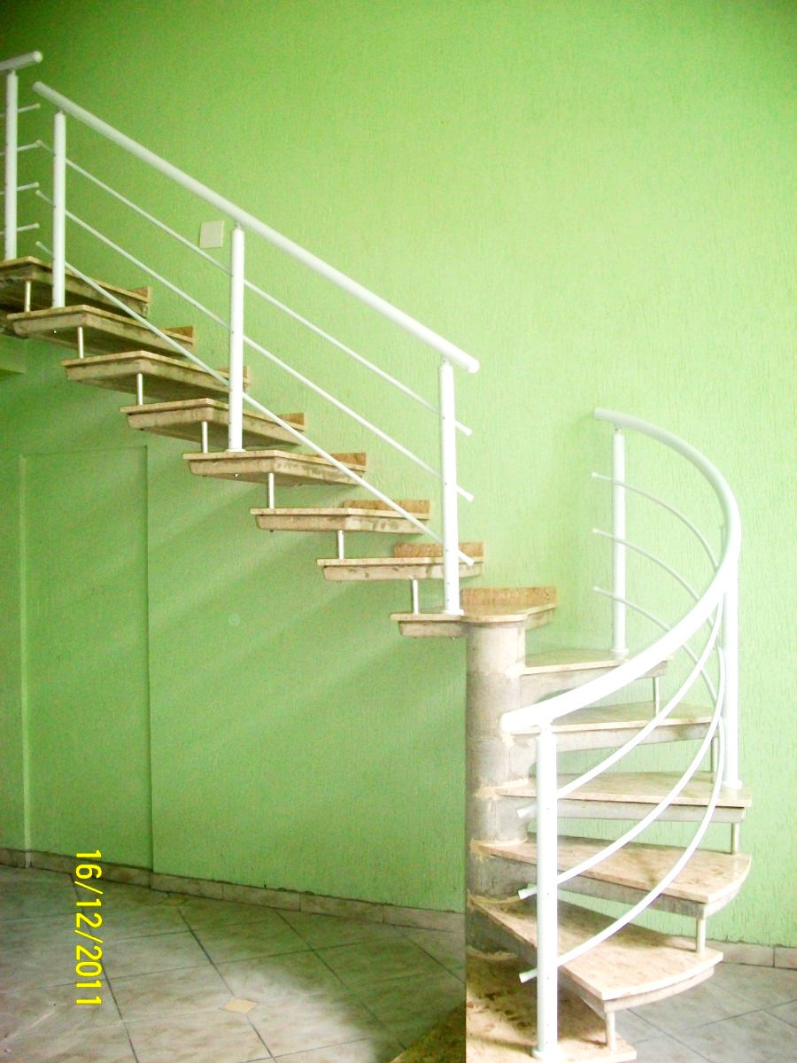 apresenta uma aparência intermediária entre uma escada em caracol completa e uma escada reta. Ela possui uma curvatura suave e gradual em seu inicio terminando em degraus retos, proporcionando uma transição fluida entre os níveis.